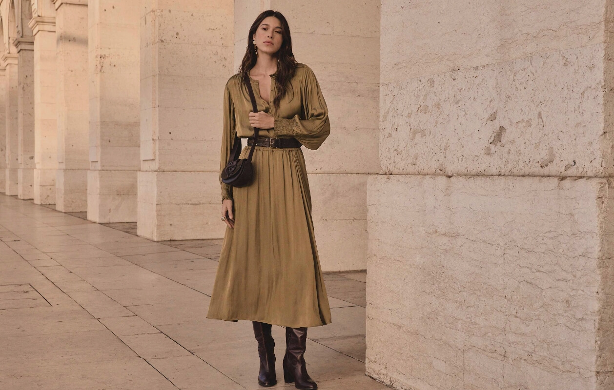 La jupe longue, délicatement bohème, est idéale pour élancer la silhouette à condition de choisir le bon modèle. Jetez votre dévolu sur une jupe fluide à la longueur mi-mollet et à la taille haute qui allonge visuellement la silhouette. Une jupe arborant une fente ou un boutonnage pouvant s’ouvrir est un plus car elle permettra de dévoiler vos jambes et de ne pas alourdir la silhouette. Si vous êtes petite, le choix des chaussures fera la différence : misez sur des bottes fines à talons pour vous élancer et vous offrir une allure longiligne. En haut, optez pour un top ou une maille que vous pourrez blouser dans la jupe pour conserver la taille haute et marquée visible.